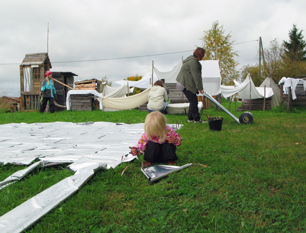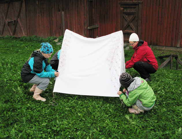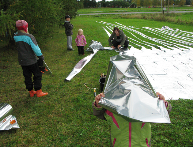 Mari Keski-Korsu’s DIY geoengineering project Albedo Dreams occured in Children Cultural Centre Lastu in Lapinlahti, Finland as a workshop for children 21. – 22.9.2013. In Albedo and Architecture -workshop, white and light buildings were constructed and the intention was to reflect solar energy back to space in order to mitigate climate change. The work spread everywhere in Lapinlahti village the next week when everyone is challenged to whiten their environments. Lapinlahti people were able to participate by covering anything they can think of with white linen, folio, light paint or other white materials. The impacts of the whitening actions are evaluated by Nea Kuusinen and Frank Berninger from Helsinki University.